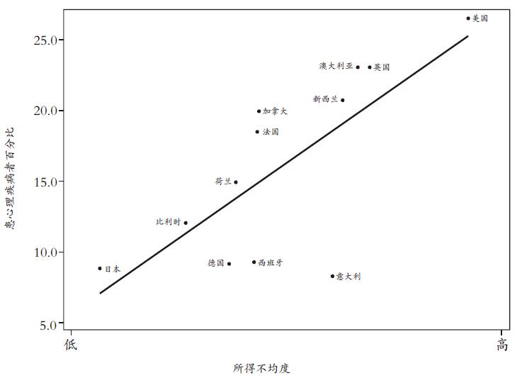 图表5.1:在较不平等的国家,患有心理疾病的人也更多。