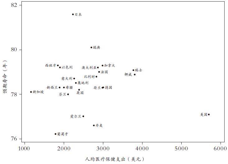 图表6.2:在富裕国家,预期寿命与医疗开支之间不存在关联(货币经过了换算,以反映购买力)。