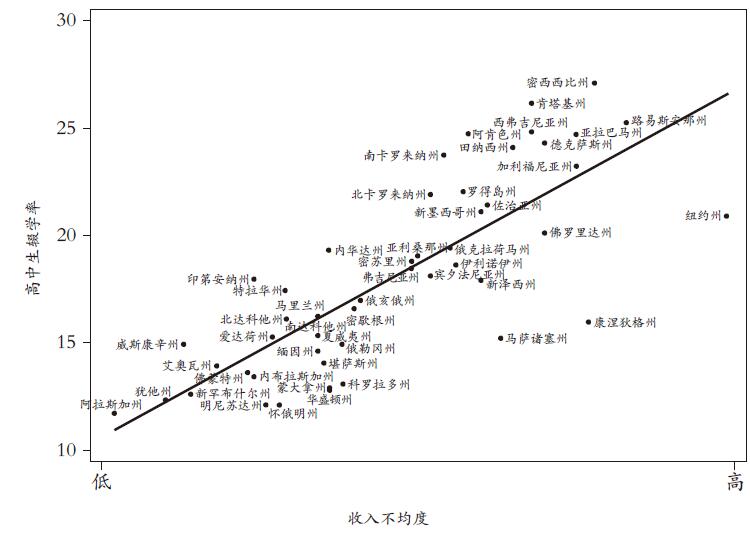 图表8.3:在较不平等的美国各州,高中生辍学率也较高。