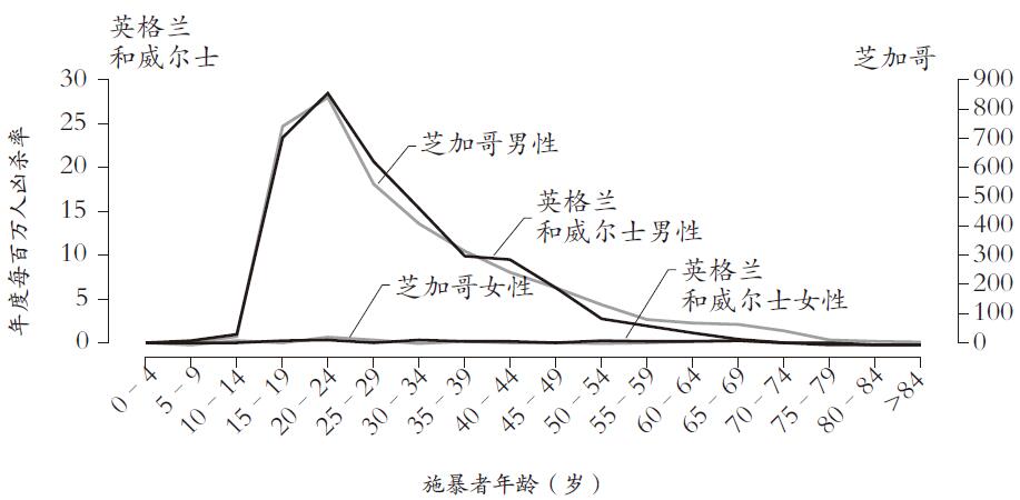 图表10.1:施暴者的年龄及性别分布;将芝加哥与英格兰及威尔士的情况进行比较。
