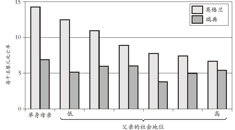 另外一项类似的研究将瑞典和英格兰及威尔士的婴儿死亡率进行了比较。研究者按照同一套分类标准,根据父亲的职业对婴儿死亡案例进行了分类。图表13.4显示了比较结果。由于无法按照父亲的职业进行分类,单身妈妈的案例被单独列出。瑞典婴儿死亡率再次全面低于英格兰及威尔士。(需要指出的是,这些研究结果都是在一段时间之前发表的,目前的死亡率要比当时低得多。)
