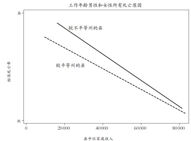 图表13.5:将美国各县分为属于较平等的25 个州以及属于较不平等的25 个州这两组之后,考察县中位收入水平与死亡率之间的关联。