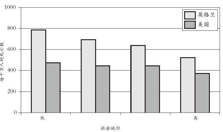 与美国相比,英格兰更加平等,也更加健康。然而,将瑞典与英格兰及威尔士的死亡率进行对比,情况就不同了。为了使比较更加精确,瑞典研究者按照英国的职业类别对瑞典的大量死亡案例进行了分类。在英国的职业类别中,位于底端的是被列为第五级的非技术体力性职业,位于顶端的是被列为第一级的专业性职业。图表13.3显示的是瑞典与英格兰及威尔士工作年龄男性死亡率的差异。与英格兰及威尔士相比,瑞典更加平等,各种职业劳动者的死亡率也更低。事实上,英格兰及威尔士最高级别职业的死亡率甚至要高于瑞典最低级别职业的死亡率。