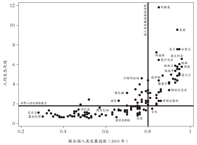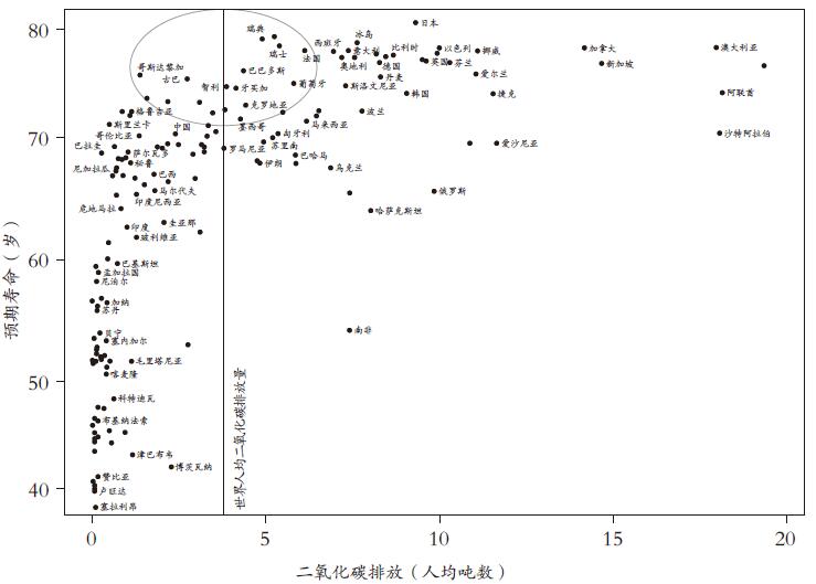在当前的技术条件下,图表15.1左上角圆圈里的国家付出较小的环境代价,换得了良好的健康状况。穿过圆圈中心的那条直线代表的是全球二氧化碳平均排放量,这表明,世界上的所有国家都有潜力在不超过平均排放量的情况下,收获较高的预期寿命。