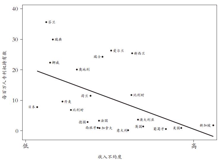 人们常常认为,创新与不平等是紧密相关的,并且需要以经济激励作为前提。然而,图表15.3表明,事实恰好与此相反:更加平等的社会往往具备更强的创造力,人均注册专利数要多于更加不平等的社会。原因可能在于,在更加不平等的社会中,更多才能未得到充分开发,或是森严的等级制度会迫使人们循规蹈矩。无论如何,这都表明不平等会削弱社会的变革能力。