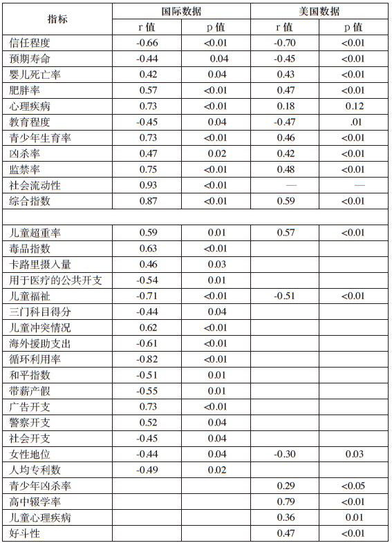 与收入不平等相关的皮尔逊相关系数(r值)及显著性差异(p值)如下。