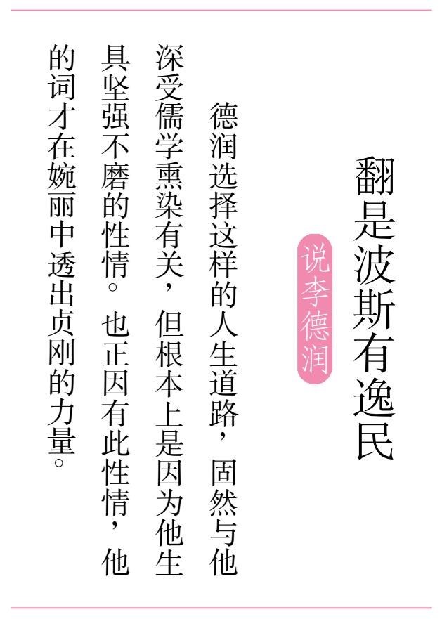 德润虽身膺外戚,但并没有靠这层关系攀龙附凤做大官,因为《花间集》仅仅把德润叫作李秀才,或者叫作宾贡。所谓宾贡就是地方政府听说某人很有才干,于是具名推荐到中央去,让朝廷来考核是不是有资格当官,到了朝廷会受到上宾一样的接待,所以叫作宾贡。另外据宋代《茅亭客话》记载,德润“ 所吟诗往往动人。国亡不仕,词多感慨之音”。他在前蜀被灭后,甘愿做遗民,其词就有很多感慨兴亡之作。