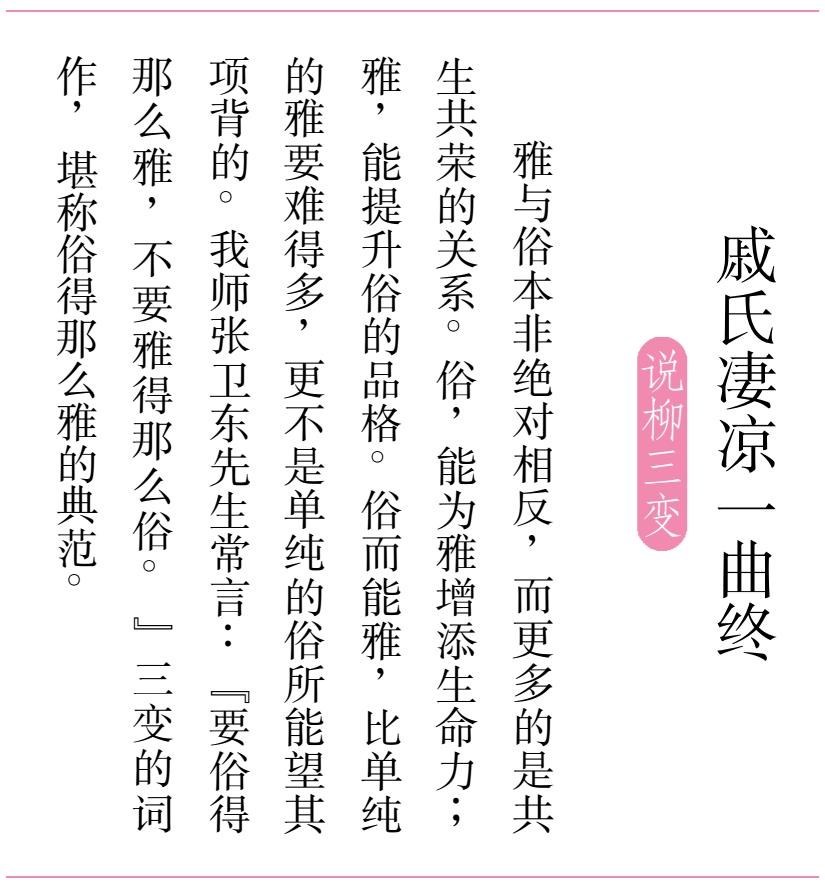 三变若生于今日,会比林夕、方文山更有影响力,当代词家中能与之相提并论的,大概只有黄霑 。可是,他生活的时代,只有“学成文武艺,货卖帝王家” 才是唯一的正途。偏偏这是一条不适合他走的道路,这就注定了他一生的痛苦矛盾。