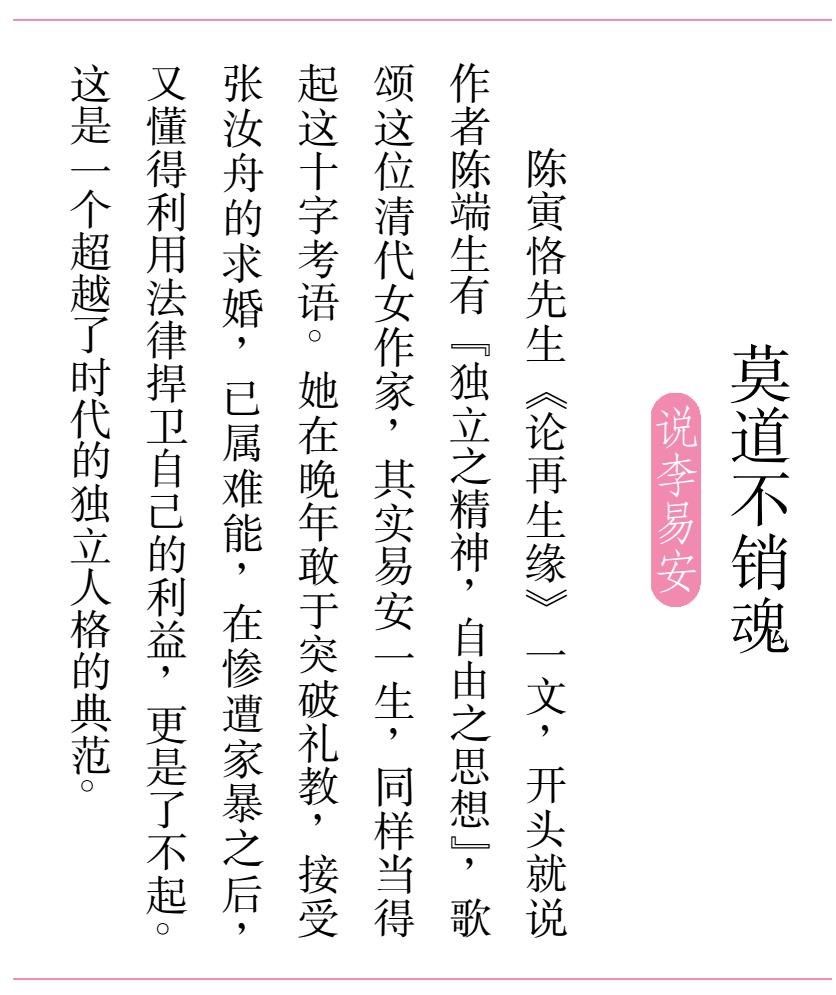 宋以后,易安词名藉甚,故《琅嬛 记》所载的故事虽然荒诞不经,而词女之说,久已深入人心。人们想到了易安,首先想到的一定是“ 女词人” 这个标签。易安的生理性别造就了她在文学史上的地位,但也局限了人们对她的进一步认知。