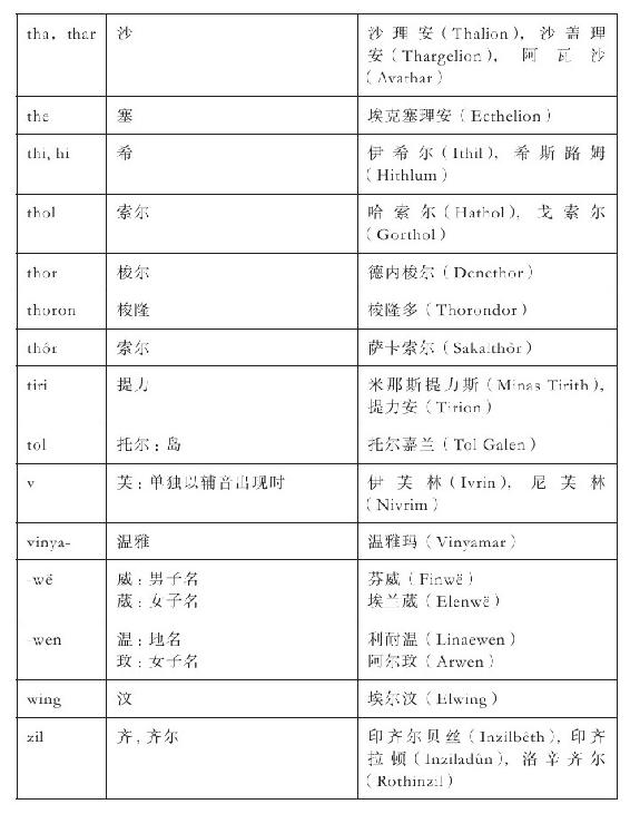 这个精简过程主要涉及这样的事实—精灵语名称的英语译名也经常作为名称独立使用。例如,辛葛王居住的地方既称为“明霓国斯”,又称为“千石窟宫殿”,有时二者还同时出现。我对这类情况的基本处理方法是,将精灵语名称和它译成的含义列进同一条目,如此一来,条目下的页数参考不限于当前条目本身(例如,“埃霍瑞亚斯”下的页数参考也包括那些列在“环抱山脉”下的)。英语译名只有在独立出现时才给出单独的条目,但只简单地指向主条目。说明中用引号括起来的部分是该名称的翻译,其中很多都在故事正文中出现过(例如:“孤岛”埃瑞西亚),但我又另外补充了很多。还有一些未曾翻译的名称,相关信息收录在《附录》当中。