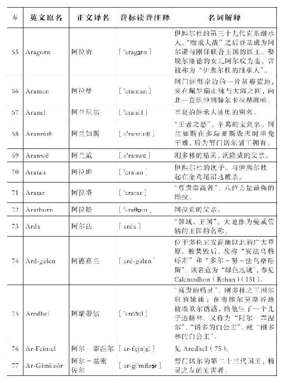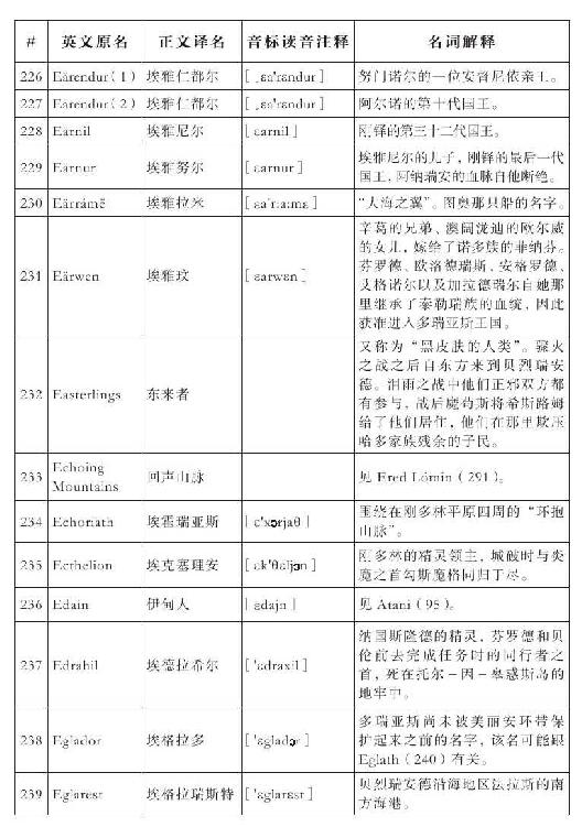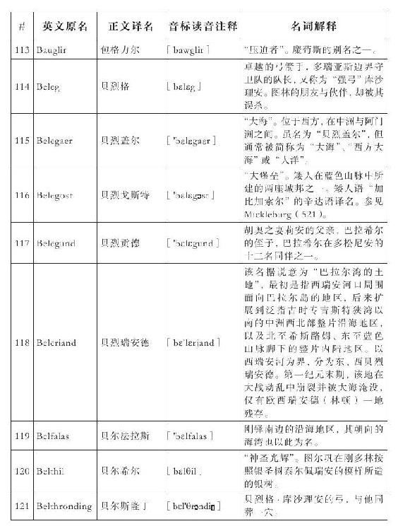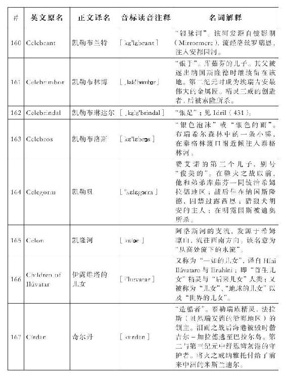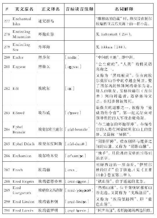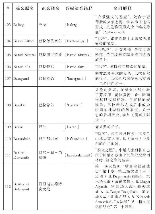 lembas:译为“兰巴斯”(而非“伦巴斯”),既为美观,又考虑其词源lenn-mbass,更是约定俗成的译法。