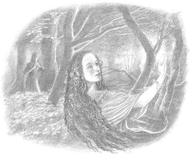 他们最爱一处林荫地,那里生长着榆树,还有山毛榉,但都不是参天巨树,还有几株栗树开着白花。不过,那里地面潮湿,林下生有一大片雾蒙蒙的蓊郁野芹。六月的某一天,他们在此玩耍,野芹的白花如同云朵,簇拥在树干周围,缇努维尔在这里翩然起舞,一直跳到黄昏消逝,夜幕降临,众多白蛾纷纷出来飞舞。缇努维尔身为仙灵,对它们熟视无睹就像很多人类孩童那样,不过她不喜欢甲虫,而因为乌格威立安提的缘故,埃尔达也绝不碰蜘蛛。但就在白蛾绕着她的头上下翻飞,戴隆吹出一个奇异的颤音时,突然间,怪事发生了。