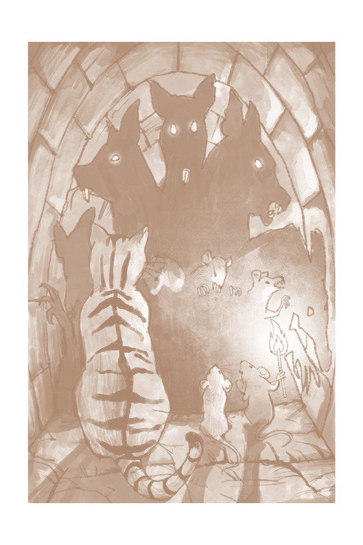 那就对我说实话吧,白老鼠。你看见我了吗?走近些!是的,你看见我了,透过你的迷雾,你看见我了。人为了取乐创造了我!把老鼠的尾巴结在一起,看它们相互撕咬!但是我没有撕咬。在一起我们很强大!一副头脑只拥有一副头脑的力量,两副头脑只拥有两副头脑的力量,但是三副头脑就有四副头脑的力量,四副就拥有了八副,八副……则是一副——一副比人的头脑更加强大的头脑。我的时机快到了。那些愚蠢的人类斗鼠,让强壮的存活下来,然后让它们再斗,让更强壮的存活下来……很快笼子就会打开,人类就会知道“鼠疫”这个词的意思了!看见那只蠢猫了吗?他想跳,可我轻松地按住了他。没有任何思想可以反抗我。而你……你很有趣。你有与我相似的思想,替老鼠们着想,不仅仅是一只老鼠。我们要的是同样的东西,我们有计划,我们追求的是老鼠的胜利。加入我们吧,在一起我们会……很强大。