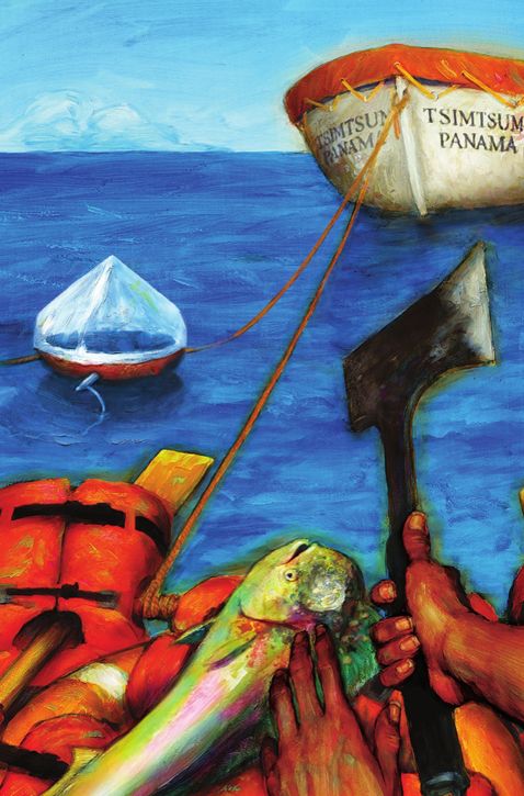 气温渐渐爬升上去。热气变得令人窒息。那天接下来的时间里,我一直都待在顶篷下面的阴凉处钓鱼。似乎抓第一条鲯鳅时,我已经用完了初学者的运气。那一整天我什么也没抓到,甚至在傍晚前海洋生物大量出现的时候也没有。一只海龟出现了,这次是一个不同的种类,是一只绿蠵龟,体型更大,壳更光滑,但是也和玳瑁一样明显地好奇。我没对它怎么样,但却开始考虑应该做点儿什么。