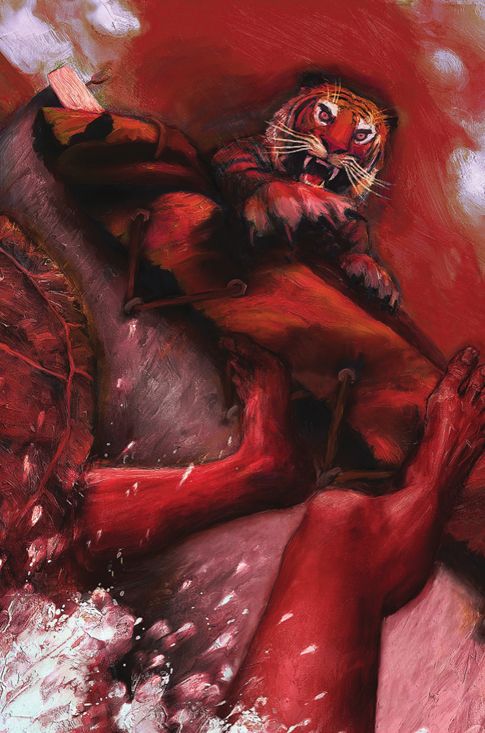 理查德·帕克四次向我表明了他的意图。他四次用右爪打我,把我打到海里去,四次都让我丢了盾牌。在他袭击之前,袭击的时候和袭击之后,我都很害怕,因为害怕而在小筏子上颤抖很长时间。最后,我学会了理解他向我发出的信号。我发现他用耳朵、眼睛、胡须、牙齿、尾巴和喉咙在说一种简单的、十分清晰有力的语言,告诉我他下一步会做什么。我学会了在他举起爪子之前就退回去。