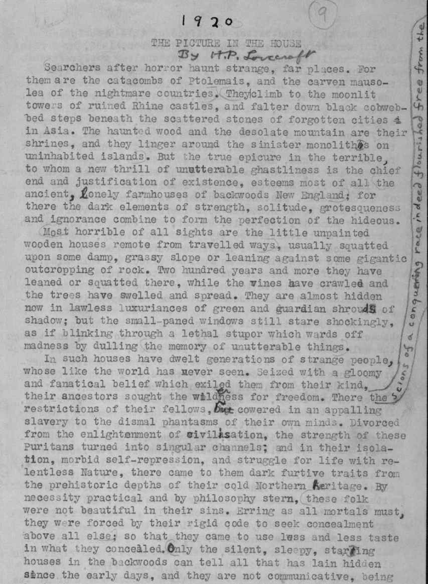 就在这些房子里面,世世代代居住着一群古怪的人,仿佛从未见过房子外面的世界。住在房子里面的人们一直狂热地坚信,他们的祖先们是为了寻找自由而去开发荒野,从而离开了自己的种族。成功了的种族后代们确实享受到了自由,不再受到原族人的约束,却成为了自己头脑中想象出来的可怕幽灵的奴隶。由于脱离了文化的启蒙,这批清教徒们的实力分崩瓦解,肢解成了一个个独立的分支。他们过着与世隔绝的生活,承受着病态的自我压抑,同时还要在残酷无情的大自然中挣扎着生存,因此形成了他们鬼鬼祟祟的性格特征,自史前时代起,继承了他们那冰冷的北方传统。在必要的实践和哲学理念之中,他们身负原罪,所以不能成为美好的化身。正如所有的凡人皆会犯错一样,他们也会在犯错之后受到法典严苛的惩罚,因而试图去寻找隐藏于法典之上的庇护之所。所以他们越来越隐藏自己的品性,最后只有他们居住的寂静又昏昏欲睡的房屋能知道他们从遥远的过去至今所隐藏的一切。他们不善交际,不想摆脱能够帮助他们遗忘的睡意。有的时候,外面的人想要把这些房屋都拆除,心想着这么做或许是件好事,因为房子里面的人一定也是这么希望的。