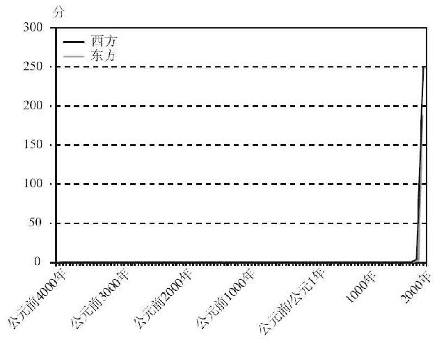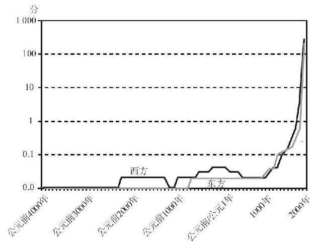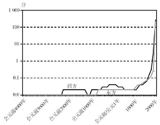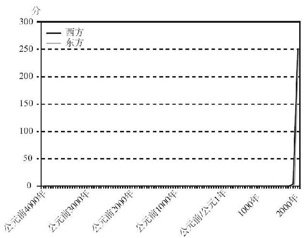 图6.1以线性–线性标尺展示了我计算的分数:1900年西方的分数不过是勉强看得到,但更早时期的分数就都看不到了。图6.2在对数–线性标尺上展现了同样的数据。不同在于,将西方1500~1800年的乘数改为0.02以反映印刷机带来的重大影响,将东方1400~1900年的乘数改为0.02以反映这段时期印刷术的巨大扩张,在线性–线性图(见图6.3)上造成不了可见的变化,在对数–线性图(见图6.4)上只能造成极小的变化。