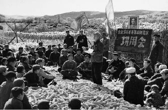 图二 1968年11月1日,吉林省东辽县河源公社革委会一位副主任在劳动间隙,与社员交流学习毛主席最新指示的体会。