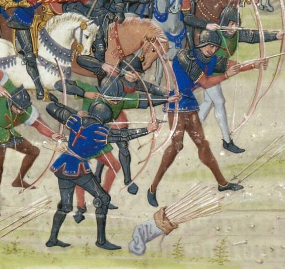 ◎ 傅华萨编年史中普瓦捷会战附图,可以看到长弓手腰中的箭和地上的箭袋。