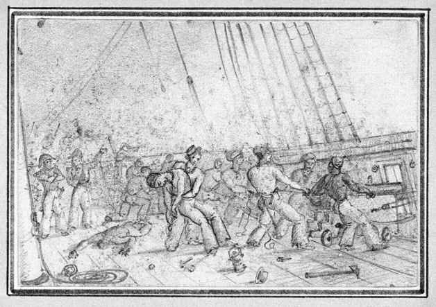 大约1800年,炮手发动暴乱。此事刚好发生在船舰的后甲板上,有一个人已经倒下了,另外一个人受伤了。(国家海事博物馆,PU8487)