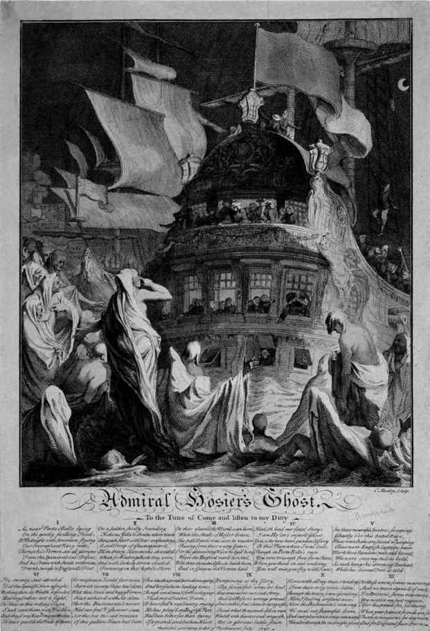 1739年理查德·格洛弗(RichardGlover)的诗,配图是霍希尔的幽灵们萦绕在前往加勒比的英国远征军周围。(国家海事博物馆,PW3959)