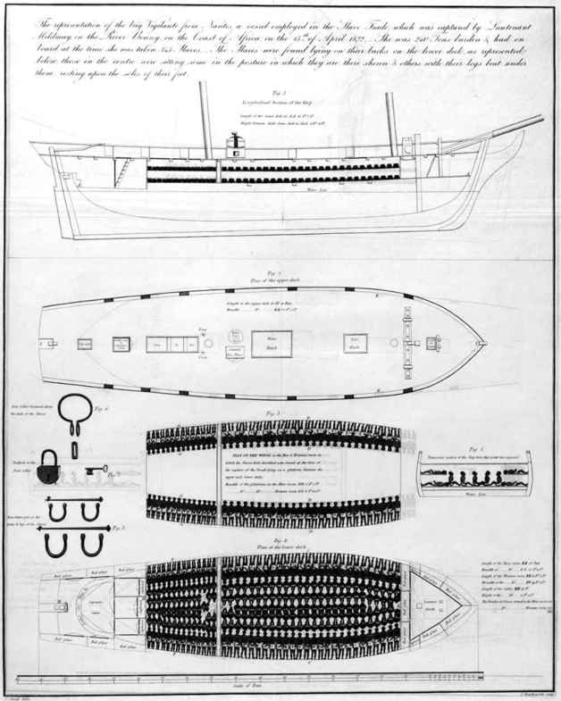 1822年在非洲海岸被俘的贩奴船“维基兰特”号(Vigilante)的甲板设计和剖面图,从图中可以看到用来束缚奴隶的铁镣。这艘船有一系列提速设备,就是为了逃脱追捕。(国家海事博物馆,F0882)