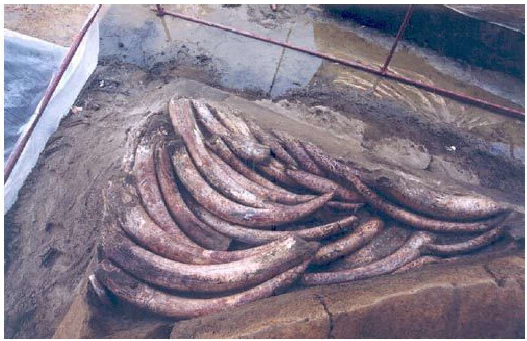 考古人员在现场首先看到的便是成堆的象牙,他们立刻联想到:1986年,在距离成都仅38公里的三星堆遗址,也出土过80根象牙。于是,两处遗址从此刻开始,便产生了联系。然而,考古人员很快又发现了两者的不同:金沙遗址中,象牙的大小和质量虽然整体不及三星堆,但在数量上,则远远超过了它的近邻。据估算,整个金沙遗址中出土的象牙有1000余根。这样奢侈地使用象牙,在中国古代是绝无仅有的。(图2,)