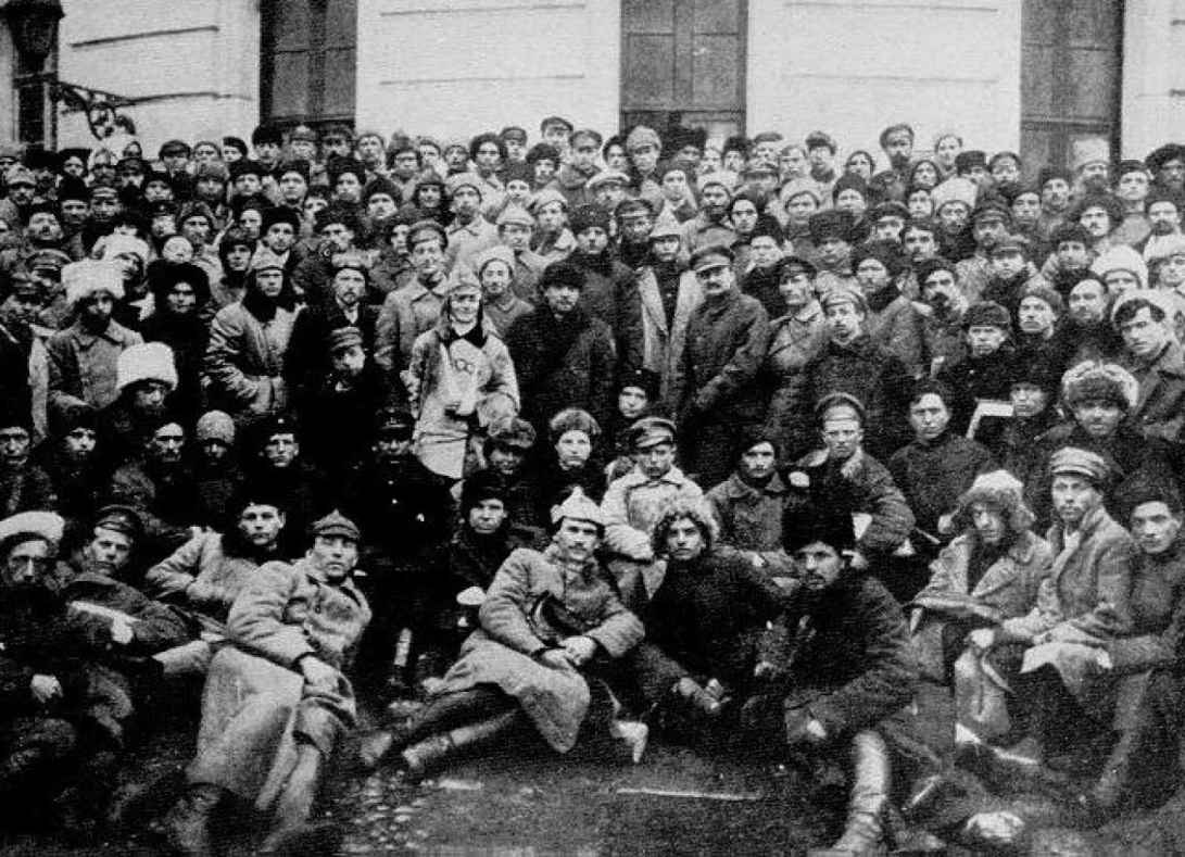 工农红军建军初期,列宁(站立者前排中央)、托洛茨基与红军指战员。列宁身后是伏罗希洛夫,但并无斯大林的身影。