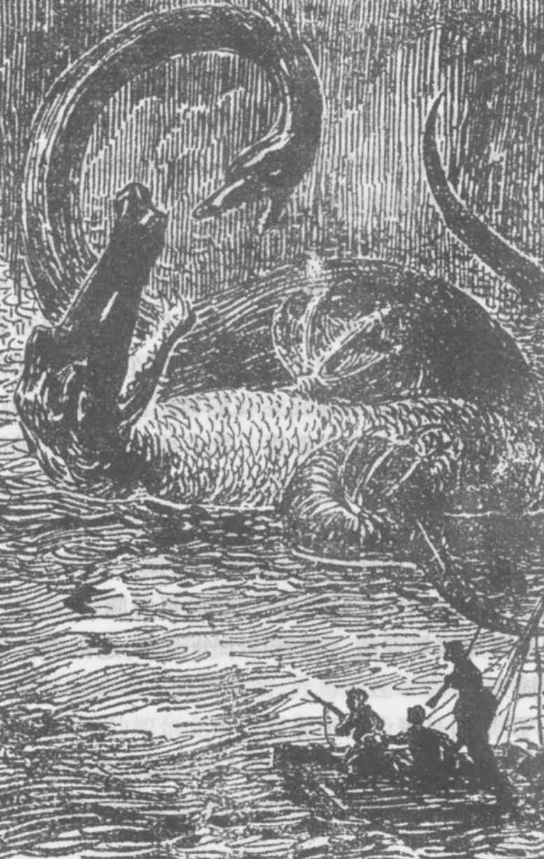 猛然,一只巨大的头颅冲出水面。这是蛇颈龙的头颅。它受到了重创。我再也看不到它的盔甲,只见它的长脖子不时举起,再落下来,犹如一根巨大的鞭子抽打着海面,它的身体仿佛被人踩过的小虫一样翻腾着。海水在我们周围飞溅,四散的水花打得我们几乎睁不开眼睛。但是,这头爬行动物很快就结束了痛苦的挣扎,它的动作渐渐缓慢,身体也不再那样狂暴地扭动,最后终于一动不动地横躺在平静的海面上。