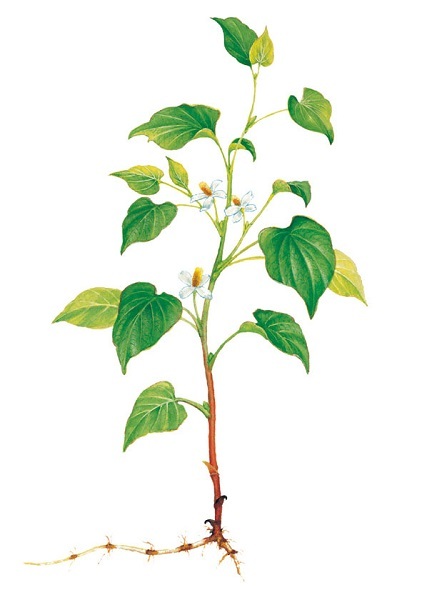 鱼腥草长在湿地或山谷阴凉处,茎紫赤色。叶子像荞麦,但比荞麦更肥大一些,颜色为一边红,一边青。山南和江东地区的人喜欢生吃,关中地区的人叫它菹菜。