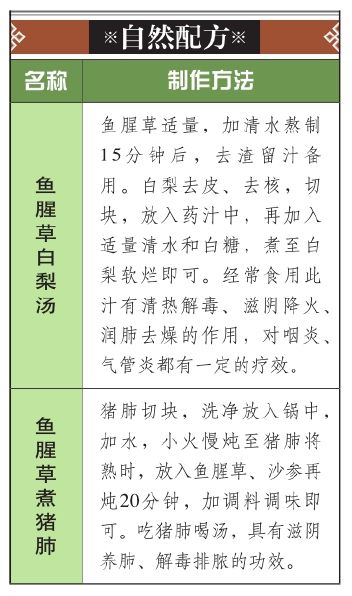 鱼腥草有极强的抗菌、抗病毒和利尿的作用,还有镇痛、止咳、止血的功效,可用于支气管炎、肺炎等病的治疗。