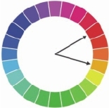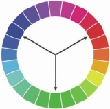 将图1色环以间隔120度区分为三等份后,此三种色相的色彩所做的配色称为“三角色配色”。图2,一般以三种色彩作为基调的配色,可以得到具有平衡感的调和色相,色相环中的邻近色相为类似色相,彼此容易配色跟调和,呈现稳定感。对比色相环指的是色环中120度至150度的色彩,具有活泼明快的效果。