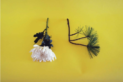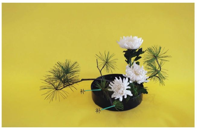 步骤三 再选一枝菊花做为整个作品的副枝,长度大约是主枝松枝的1/2,直立插置在剑山上,以增加作品的高度。