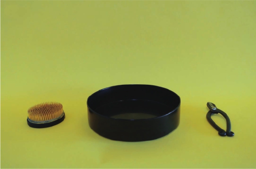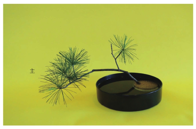 步骤一 先将剑山放在水盘的的一侧,主枝选择一枝松枝,长度大约为水盘的直径与高度的和,让水盘的水面更宽阔一些,往一侧倾斜插好。