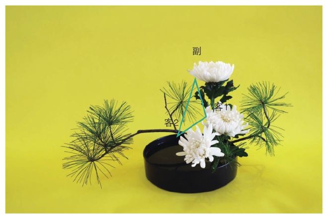 步骤四 再选择两枝菊花做为客枝,长度大约是副枝菊花的1/2,一枝往右前倾斜插置在副枝菊花的前面,一枝往左前倾斜插置在副枝菊花的左前侧,也是呈三角形的布局。