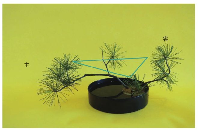 步骤二 再选择两枝松枝做为松枝主枝的副枝和客枝,副枝的长度大约是主枝的1/2,客枝的长度大约是副枝的1/2,以三角形的布列插置在剑山上。
