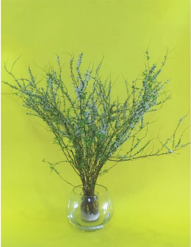 雪柳,灌木植物,分布地区较广,从北方的河北到南方的湖北都能看到它的身影。因其质感比较坚硬,在插花之前,我们通常将它的根部剪出一个十字的切口,这样便易于我们把它固定在剑山上。