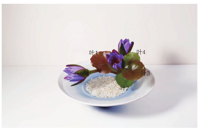 步骤五 在第一枝和第二枝睡莲的中间,向着第一枝睡莲的方向插置一片银荷叶,在第二枝睡莲的前下方,向着水面的方向插置一片银荷叶。