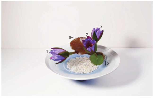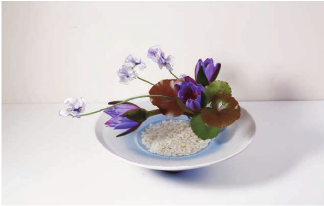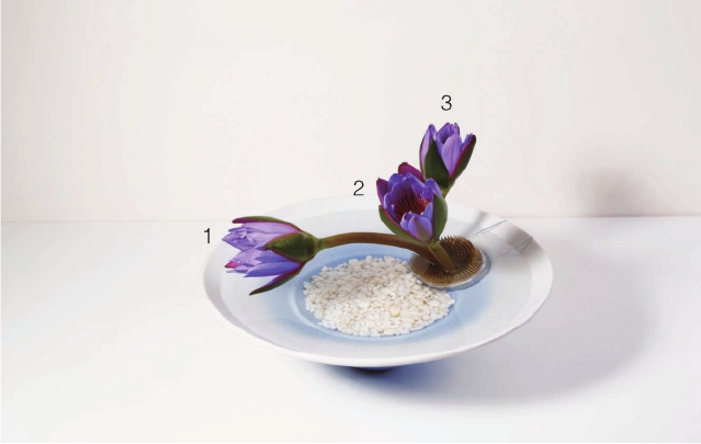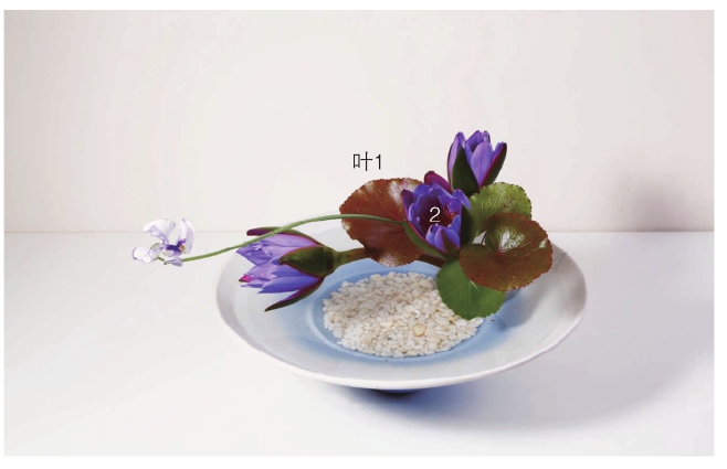 步骤四 剪两枝睡莲,分别插置在第一枝睡莲的前方和后方,第二枝睡莲的长度约为第一枝的1/2,注意花头向水面,但花头要向着观赏者的方向探出。
