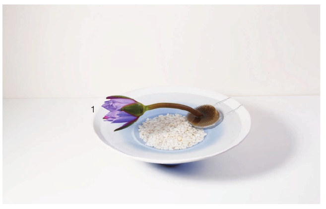 步骤三 将一枝长度约为花器直径长度的睡莲,插在剑山的圆心部分上,花头向水面探出。注意睡莲的根部是空心莲藕状,不宜反复插。