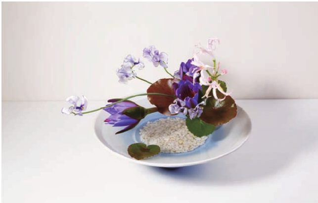 步骤九 围绕着第二枝睡莲,在银荷叶的空间当中,我们补添插一些短小的豌豆花,高度比第二枝睡莲略低。
