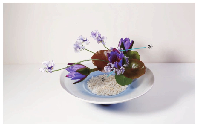 步骤六 围绕着第二枝睡莲的右侧,分别插上第三片与第四片银荷叶,注意它们的高度应错落叠加,隐隐约约相互遮挡,但并不完全遮盖,从正面观赏时,以看不见剑山为佳。