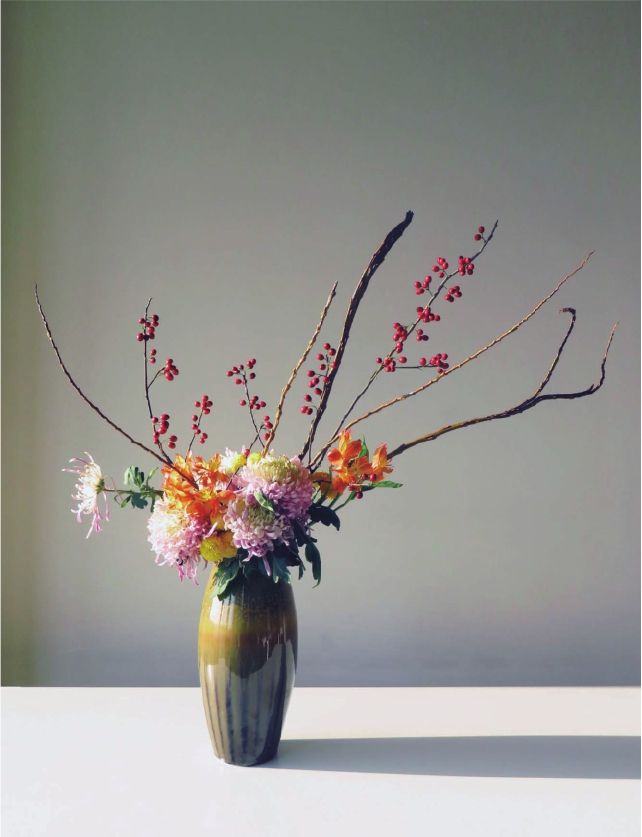 步骤九 在左侧靠近瓶口处的空间里,我们插上几枝金黄色的小菊花,能将叶片和底部较暗的空间填补一些颜色。在上部分的空间中,投入几枝石化柳,挑选线条粗细状态不尽相同的,穿插在冬青果之间,既丰富了空间层次,节奏上也更有天趣生动。
