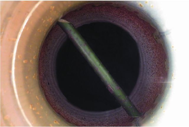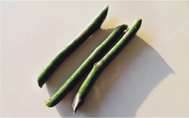 步骤一 我们先制作一个有难度的花留。剪几枝与花器口直径相当的枝条,将备好的枝条两头斜剪,严丝合缝地卡在花器口直径处。