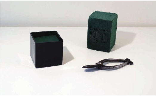 准备工具 方形的黑玻璃花器一只、蕨手剪、花泥一块、金色铁丝一把、透明胶一卷、铁丝剪一把
