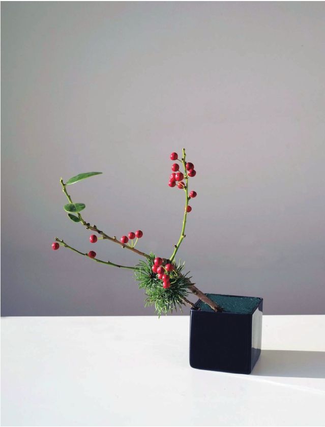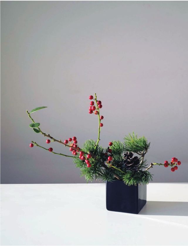 步骤二 剪一枝较粗壮的冬青,长度可以为花器高度的2.5倍,插在花泥上,往左前方倾斜,大约与花器呈45度斜角。