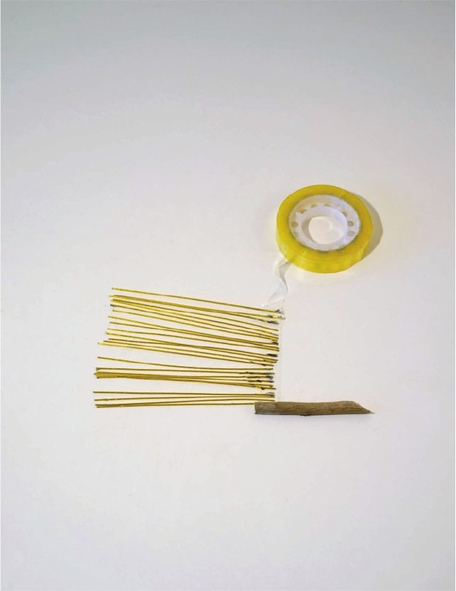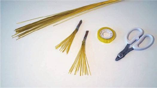 步骤一 将金色的铁丝剪出若干根,一头用干树枝卷起固定好,将剪好的铁丝段一条条地平铺在透明胶上。然后像卷纸一样,一点点地把它们卷在木棒上,用透明胶粘好固定好。可以用手指轻轻地将铁丝向外掰,形成一个以木棒为圆心伞状的骨架型。