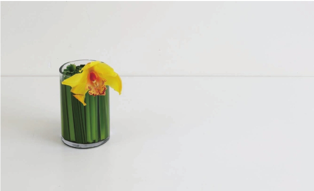 将蒲棒叶剪成略低于花器1厘米左右的长度,一条条地紧密排列塞进玻璃花器中。蒲棒叶是多年生水生或沼泽生植物,叶茎细长粗壮直立坚挺,是花艺中极好的固定植物。这一节中将它运用到花道的插置中,插置一款自由的小桌花。