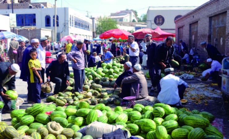 市场里的地毯店众多,一路逛过去,眼花缭乱,每一家那些堆积如山的毯子,一捆捆就搁在地上,看起来就跟做廉价批发一样,但一问,随便一张小毯子的价格,都令人咋舌。除了新疆本地的老毯子,更多是中东来的,伊朗与土耳其的羊毛地毯,远近闻名,但价格也昂贵。好看的毯子太多了,心里喜欢,爱不释手,但时刻不忘提醒自己,这是穷游、穷游、穷游。挑来挑去,最后只舍得买下一张小小的,跟老板讨价还价很久,成交价格依旧令我心疼。羊毛毯厚重,我一个背包自然没法背回去,在这个市场里,不管你买干果还是纪念品,嫌东西重不方便携带?没关系,帮你叫快递。
