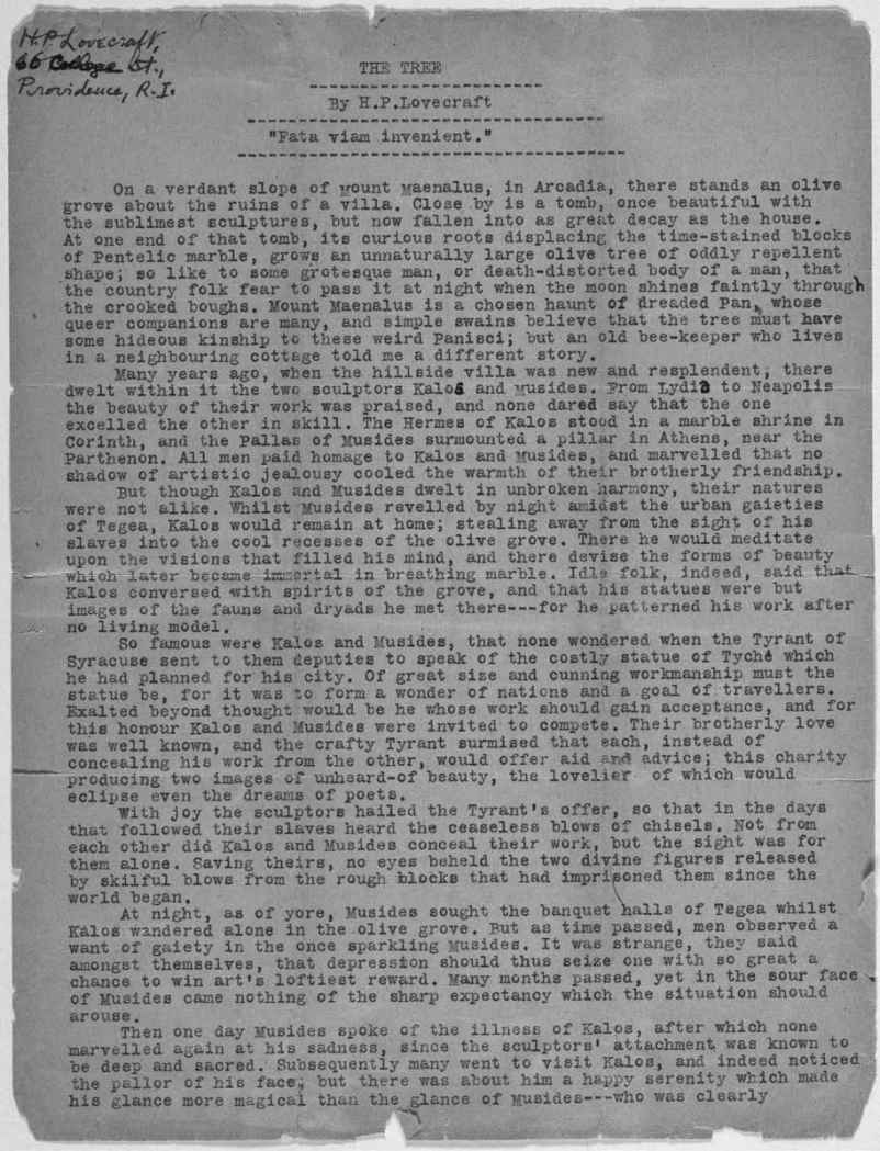 《树》这篇小说可能写于1920年春天。从洛夫克拉夫特对历史细节的描写中,能推断出这个故事的发生背景可以精确到公元前四世纪中叶。但事实上,洛夫克拉夫特早在读到邓萨尼勋爵的作品之前就已经构思出了这个故事。本篇小说首次发表在《试验》杂志的1921年10月刊上。